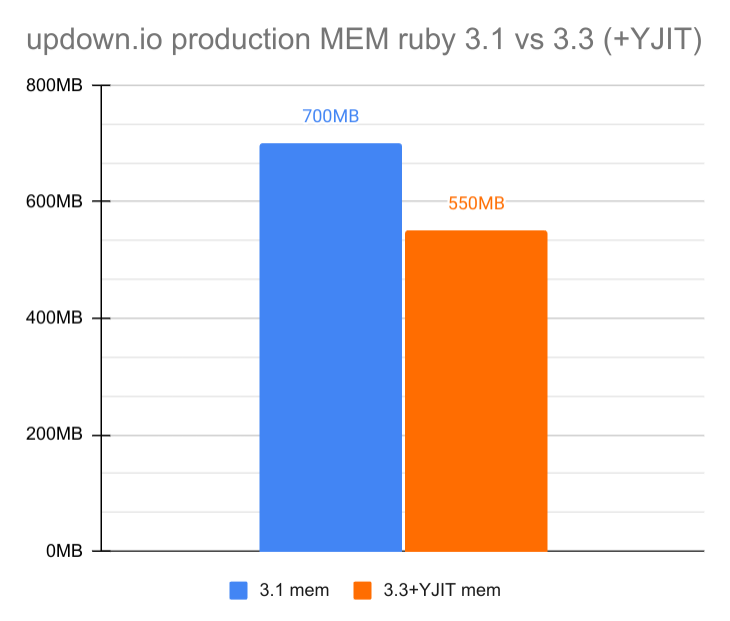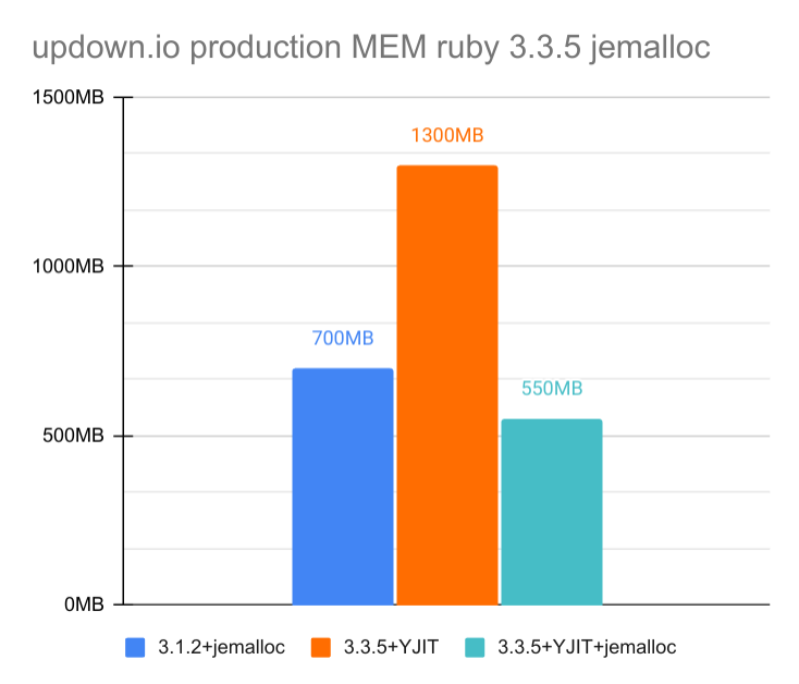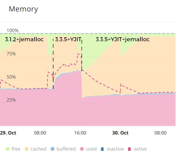 Another thing I noticed during my benchmark of 3.3.5 is that using jemalloc or not (on Linux) had a very small impact, the memory usage was almost the same. So I though maybe I don't need to use jemalloc anymore and I tried deploying one server with 3.3.5+YJIT but without jemalloc in order to compare the memory usage in a real world scenario: