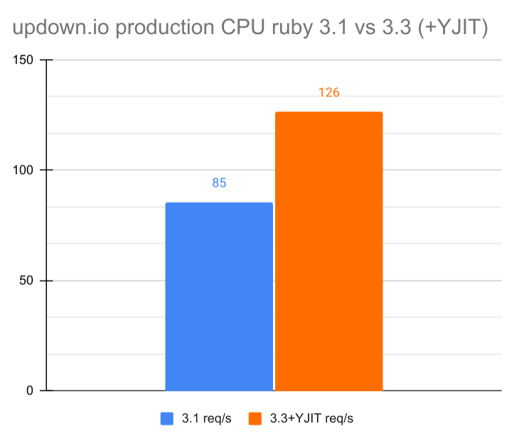 It's a different story on the web server part, I didn't even look at the numbers because it's a very small load on updown and with most of the time spent waiting on database requests, the difference wouldn't be very visible. On a more high-traffic and ruby-heavy web application though, the impact should be visible.