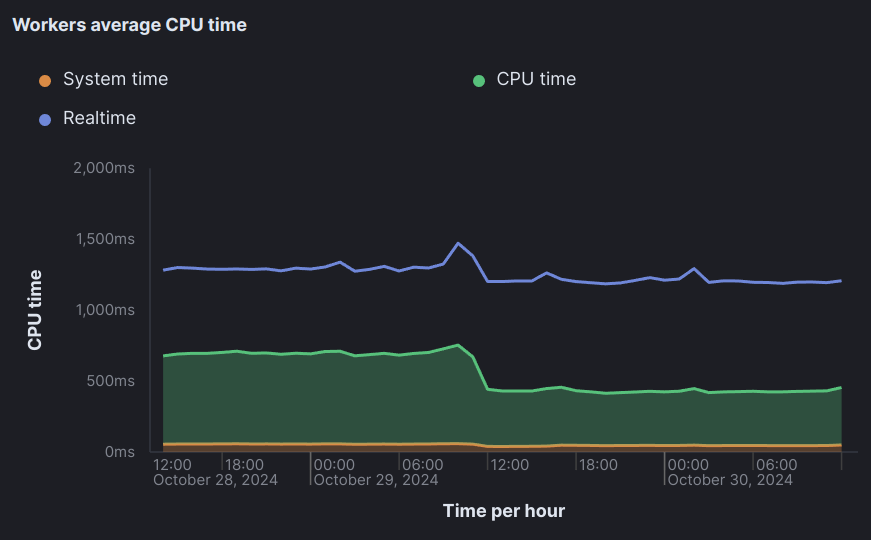 - I'm not improving much the total time of the worker here (blue) because it's more than 50% IO wait time, but it's not important in my case (and for background jobs in general) because I can run them concurrently and the user is not waiting for the response. So what's important is how much CPU each job needs (green):