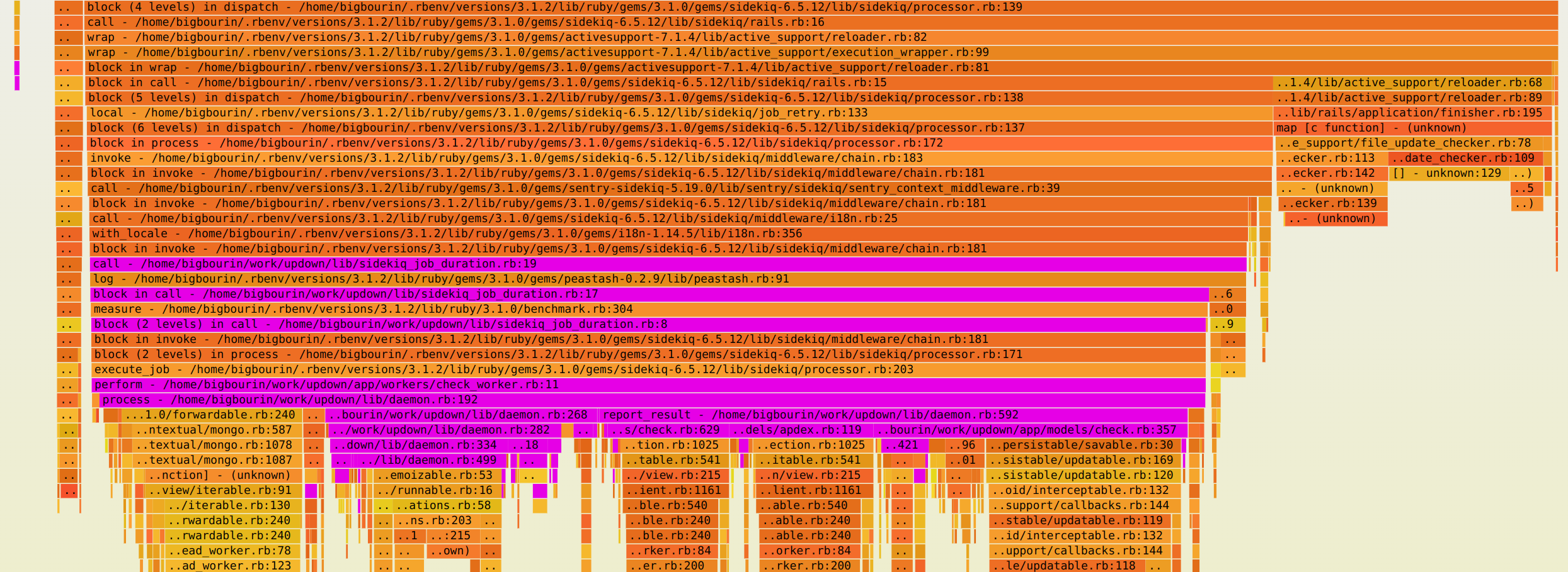 Aha ! There's definitely something huge visible here. What I highlighed in purple here is basically the meaningful work performed by the worker. And the remaining part on the right side (which is taking much more time since 3.3) is ActiveSupport::Reloader.