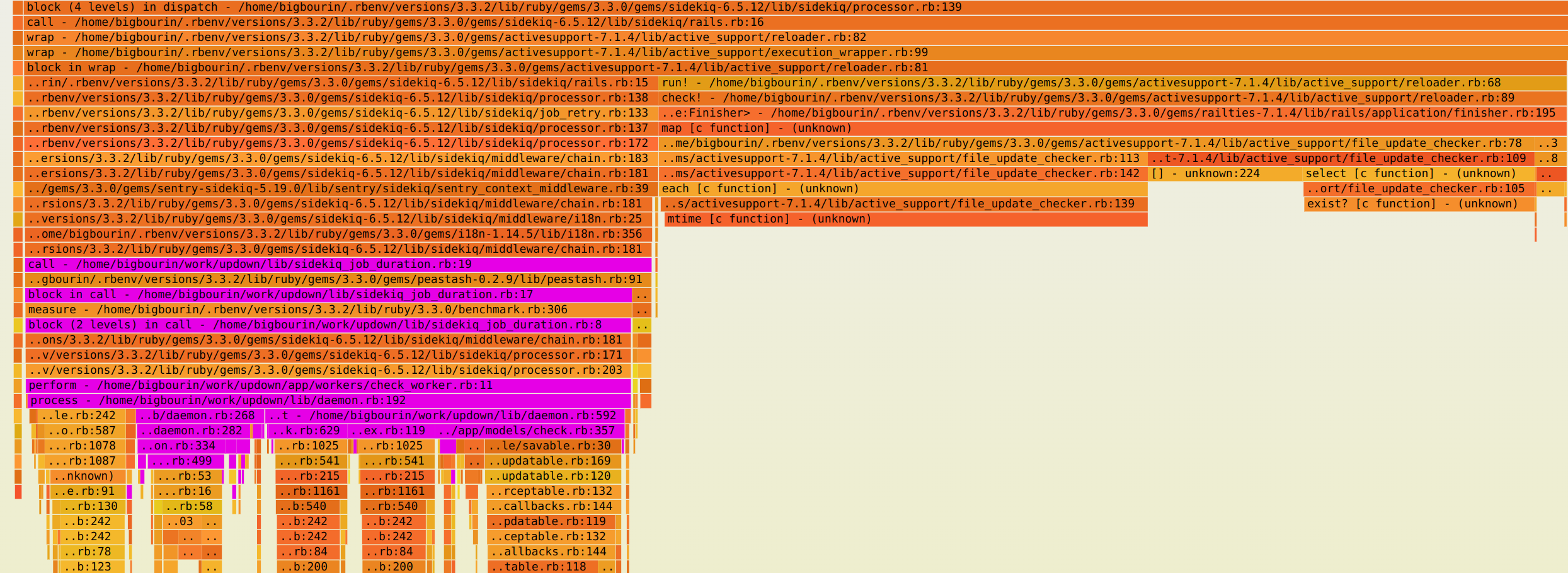 Just to be sure, I added two extra counters at the exact place were we call File.mtime (the C function) and File.exist? (another C fuction). These two functions are the bottom of the two biggest flames under the right section (the ActiveSupport::Reloader). We can't see inside because the functions called from C do not appear in the Ruby backtrace monitored by rbspy.