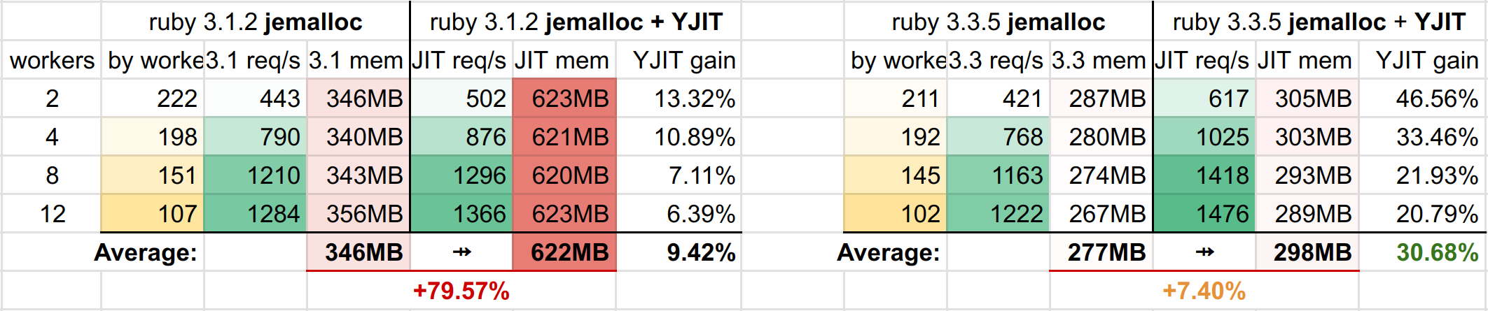 | 3.1.2 + jemalloc + YJIT | 321 | 600 MB | 7% faster with YJIT |