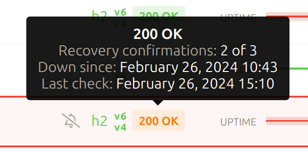 Since 2024-02-26 The same thing happens at recovery, once a downtime is started, we'll require three up check to close the downtime. Like for downtime confirmation, these checks will run twice as fast and from at least two different locations. This help reduce the risk of false negative (e.g. closing a downtime after one lucky good checks while most other requests are still failing). It also helps reducing the amount of spam in case of flappy state (e.g. your website is only reachable from some locations or only responds to 25% of requests), updown will create fewer up/down/up/down alerts in this scenario.