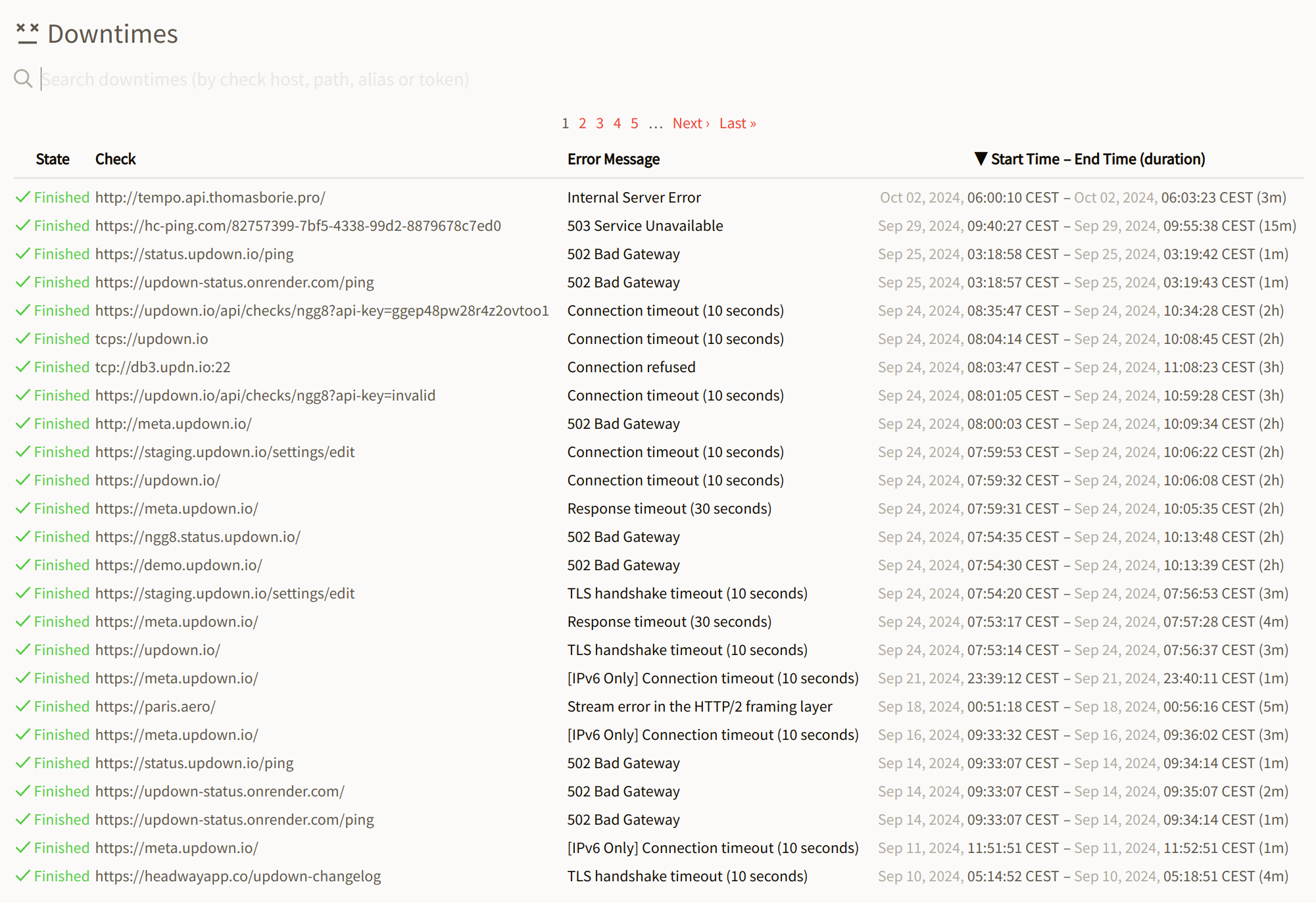 This is a really helpful feature for reporting back to stake-holders. I tested the API, and although you get time and duration of a failed check, I would also like to see (both on the web page and the API) from which location/locations the check failed. That is a nice way to identify if there is a routing problem causing a false positive, or if it is a wide-spread outage.